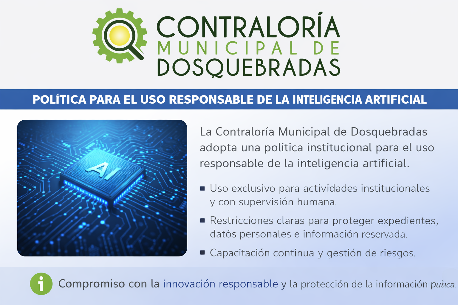 Con esta iniciativa, la Contraloría Municipal de Dosquebradas reafirma su compromiso con la innovación responsable, alineando el uso de nuevas tecnologías con los principios de transparencia, legalidad y ética pública, en concordancia con los lineamientos del Programa de Transparencia y Ética Pública.