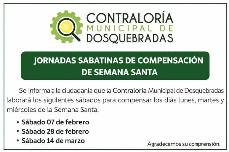 La Contraloría Municipal de Dosquebradas informa a la ciudadanía que, mediante la Resolución No. 019 del 05 de febrero de 2026, se autorizó la modificación temporal del horario laboral con motivo de la Semana Santa.