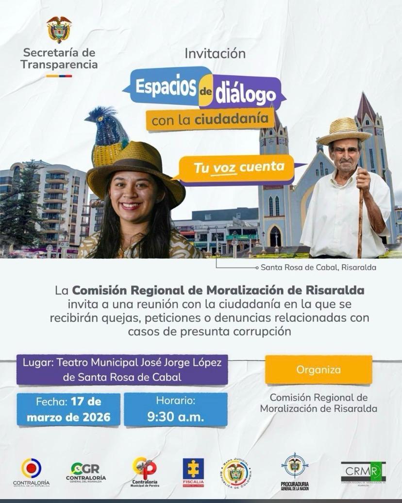 La Contraloría Municipal de Dosquebradas invita a los veedores ciudadanos, líderes sociales, organizaciones comunitarias y a la comunidad en general a participar en el espacio de diálogo con la ciudadanía que realizará la Comisión Regional de Moralización de Risaralda, un escenario de participación orientado a fortalecer la transparencia y la lucha contra la corrupción.