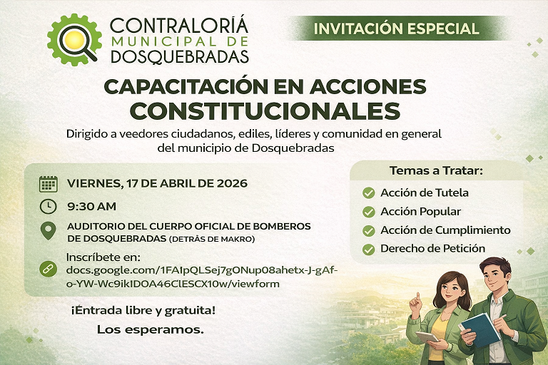 Dosquebradas, Risaralda. Con el firme propósito de empoderar a la ciudadanía y fortalecer el control social sobre los recursos públicos, la Contraloría Municipal de Dosquebradas anuncia la realización de la jornada de capacitación: "Herramientas y Acciones Constitucionales para el Control Ciudadano".